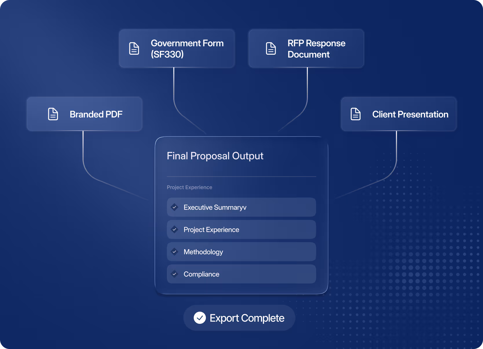 Export to any required format and eliminate formatting challenges— branded templates, government forms, SF330s, RFP response documents, polished leave-behinds — pixel-perfect and on-brand, every time. What used to take your team days now takes hours.