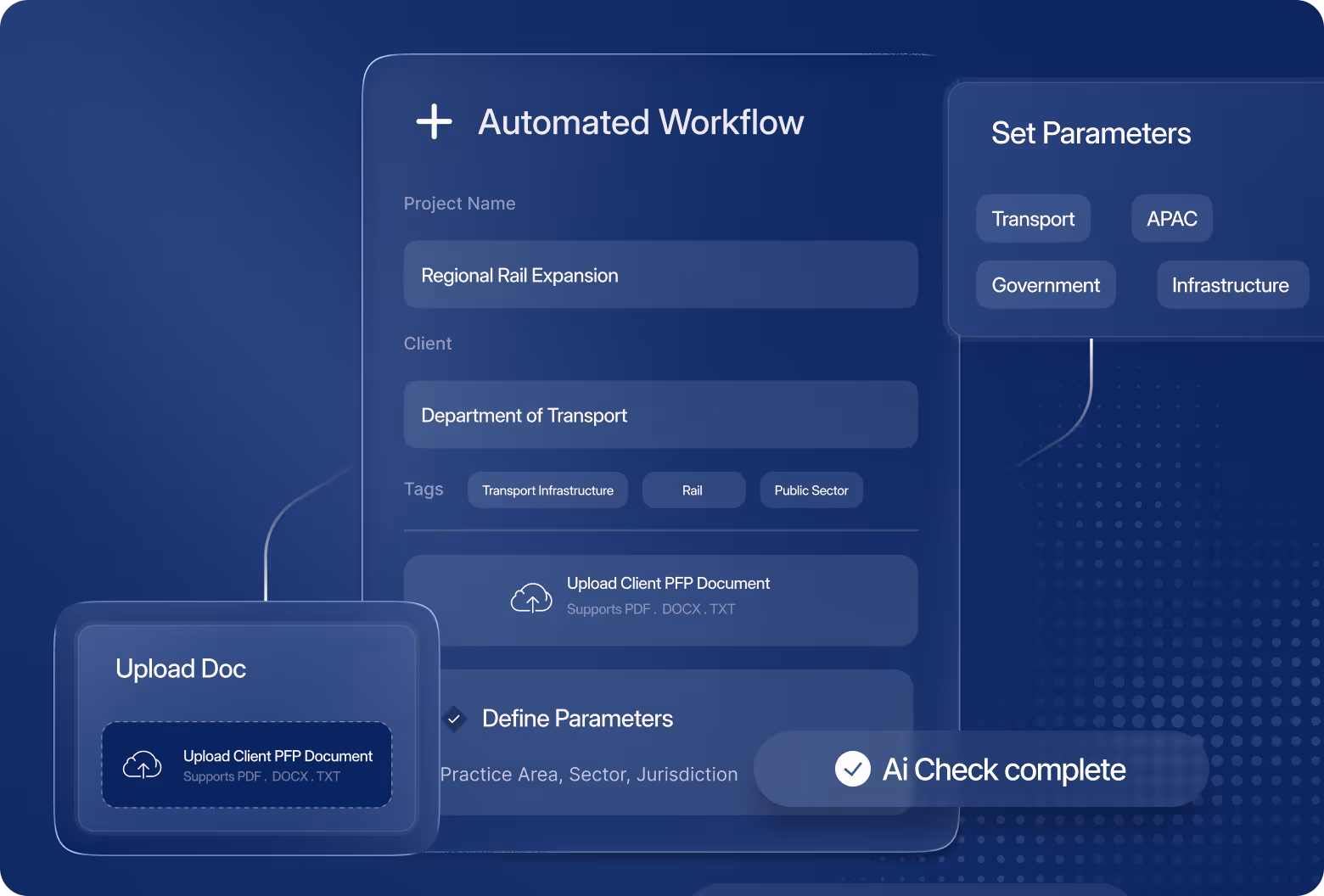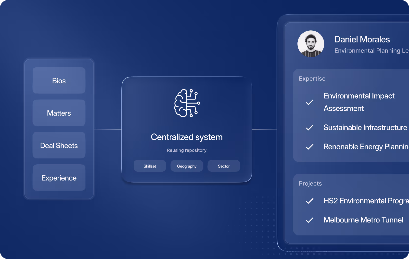 Leverage a centralized, searchable library of bios, matters, and deal sheets to build consistently compelling responses across every practice area.